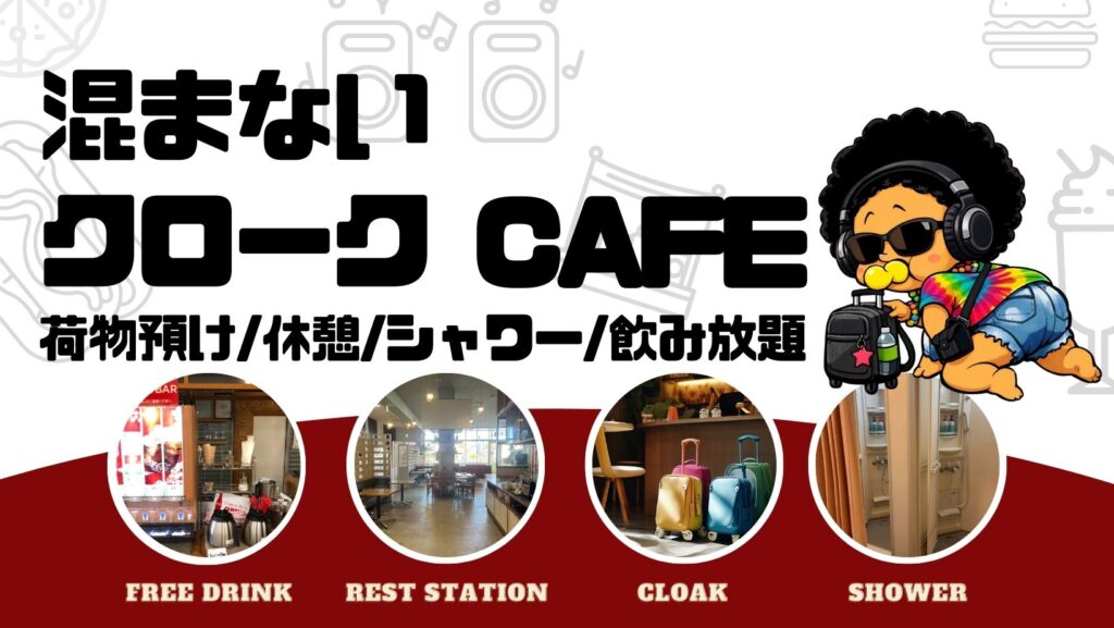 クローク1日料金は事前予約1300円(ドリンクバー・シャワー利用・充電OK)です。